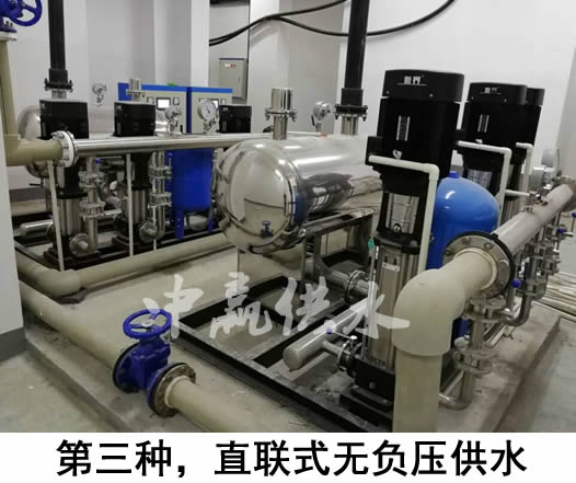 如果地下室沒(méi)有儲(chǔ)水池或不銹鋼水箱,而是直接通過(guò)中贏無(wú)負(fù)壓供水設(shè)備疊加市政管網(wǎng)已有壓力進(jìn)行加壓的,由于它是與自來(lái)水管道是串聯(lián)的,密封性非常好,所以不會(huì)產(chǎn)生二次污染,大家可以放心使用(自來(lái)水--無(wú)負(fù)壓設(shè)備--用戶(hù))。第三種供水方式